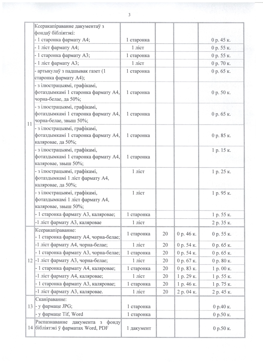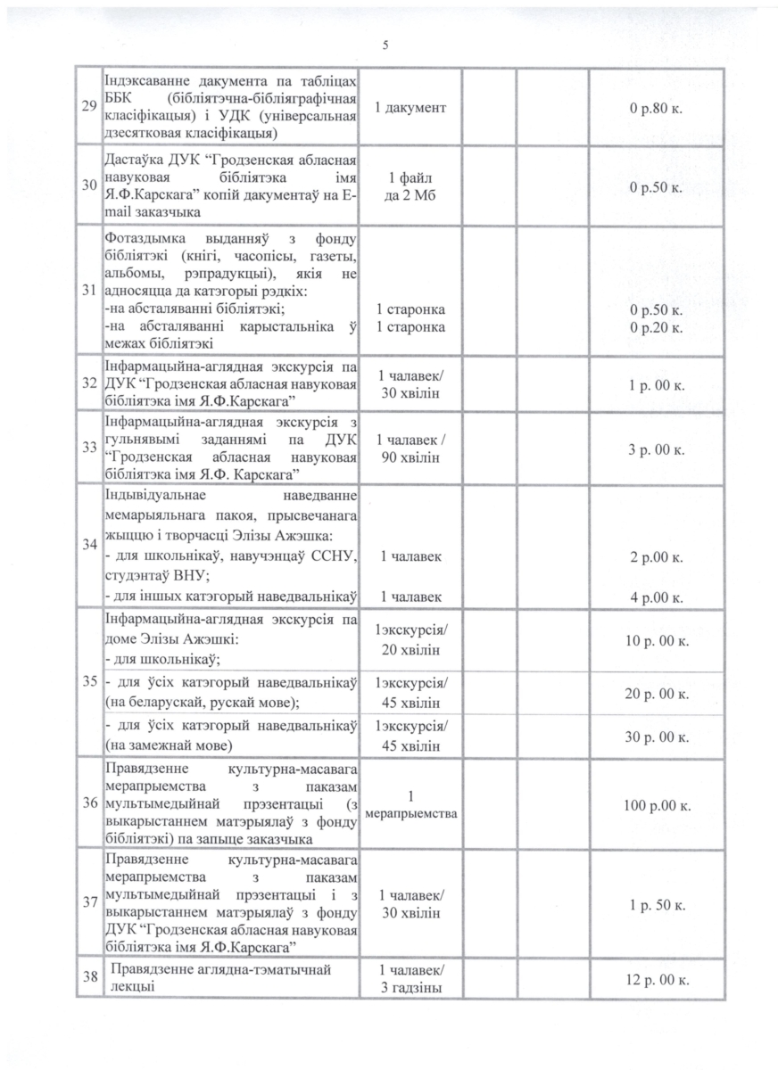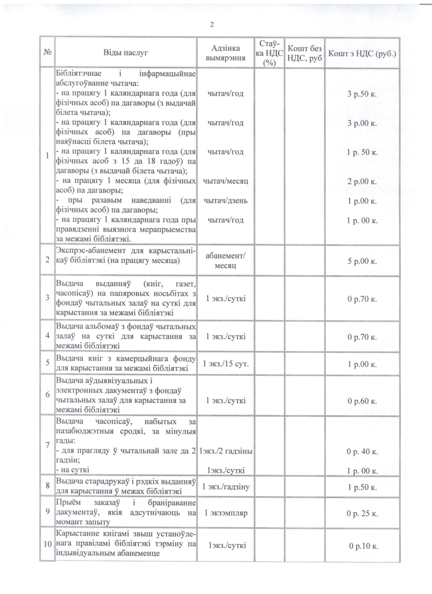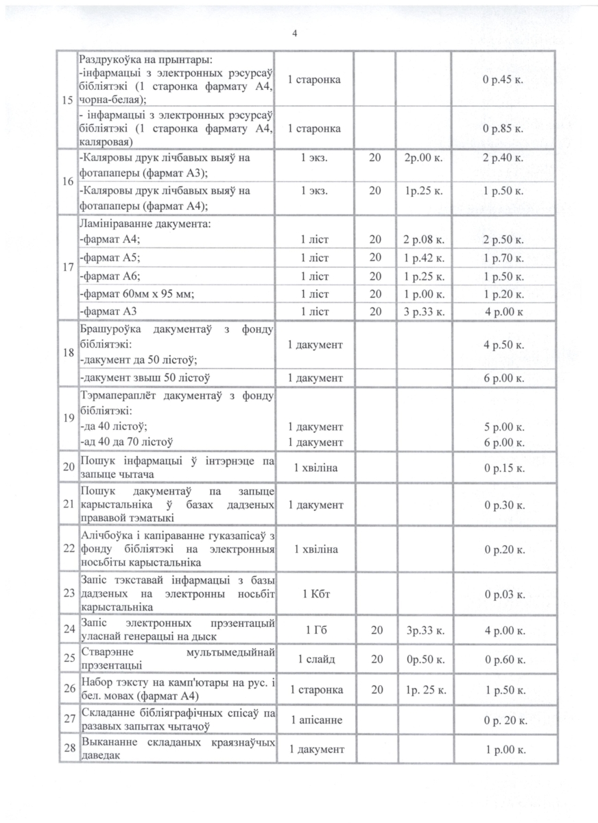 Прэйскурант платных паслуг