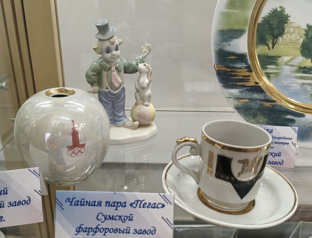 Отдельно хотим выделить экспонаты, предоставленные Гродненским областным драматическим театром. Это тарелка из лимитированной коллекции Императорского фарфорового завода с позолотой для участников 16-го Международного фестиваля «Встречи в России». Ваза 1980 года с символикой XXII летних Олимпийских игр. Чайная пара «Пегас» Сумского фарфорового завода 70-80 годов ХХ века. И фарфоровые клоуны.