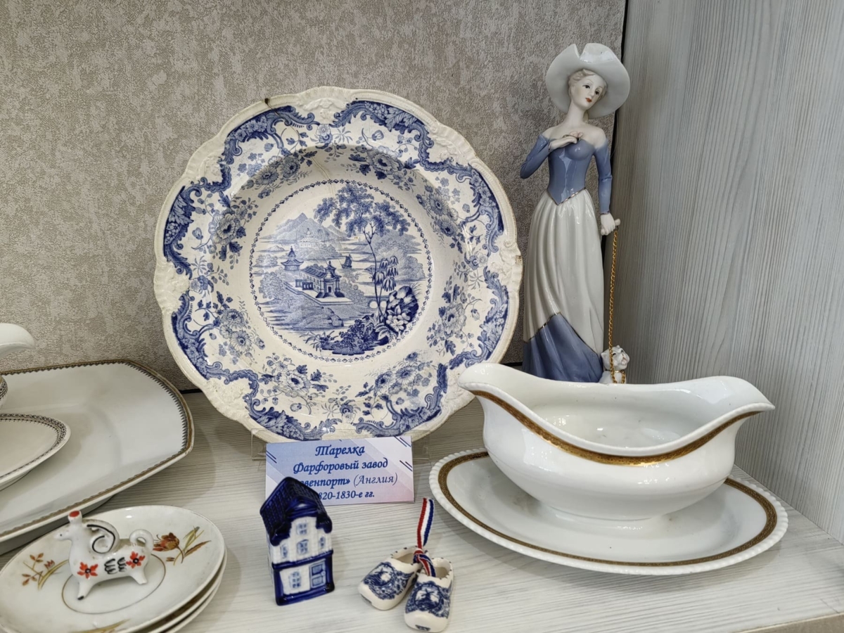 Самый раритетный экспонат выставки – английская фарфоровая тарелка 1820-1830 годов фабрики Давенпорт. Блюдо расписано в стиле бело-голубой керамики, узор имитирует традиционный китайский пейзаж.