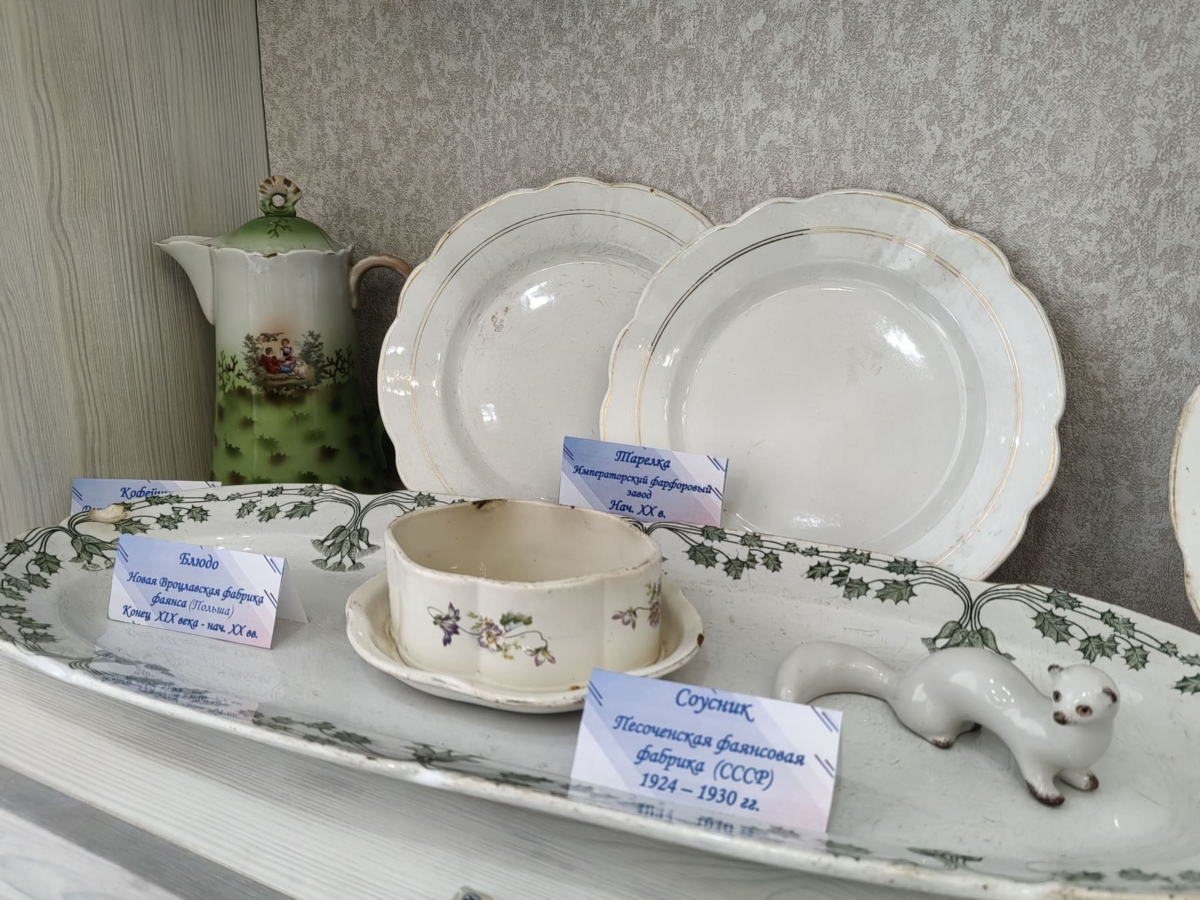 Привлекают к себе внимание большие блюда для подачи мяса и дичи конца XIX века, немецкая резная тарелка с позолотой и французская с цветной росписью, которые были изготовлены в начале ХХ века на европейских заводах.