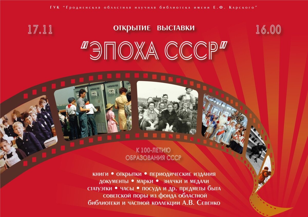 К 100-летию образования Советского Союза в отделе искусства Гродненской областной научной библиотеки имени Е.Ф. Карского 17 ноября в 16.00 состоится торжественное открытие выставки «Эпоха СССР». Она напомнит о тех вещах, которые окружали людей в советское время, расскажет об уникальности и значимости советской культуры и быта.
