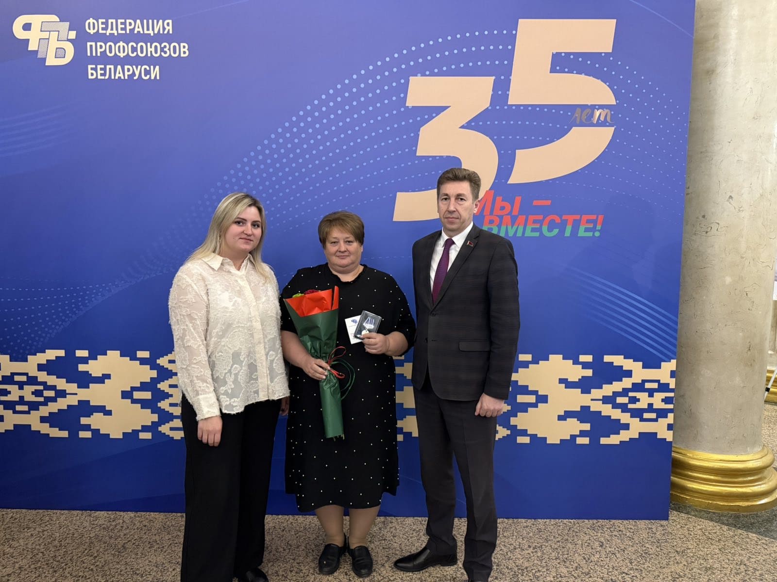 На мероприятии, посвящённом 35-летию со дня создания Федерации профсоюзов, председатель Гродненской областной организации Белорусского профсоюза работников культуры, информации, спорта и туризма, Денис Малевич торжественно вручил Ирине Казимировне медаль «120 лет профсоюзного движения Беларуси».