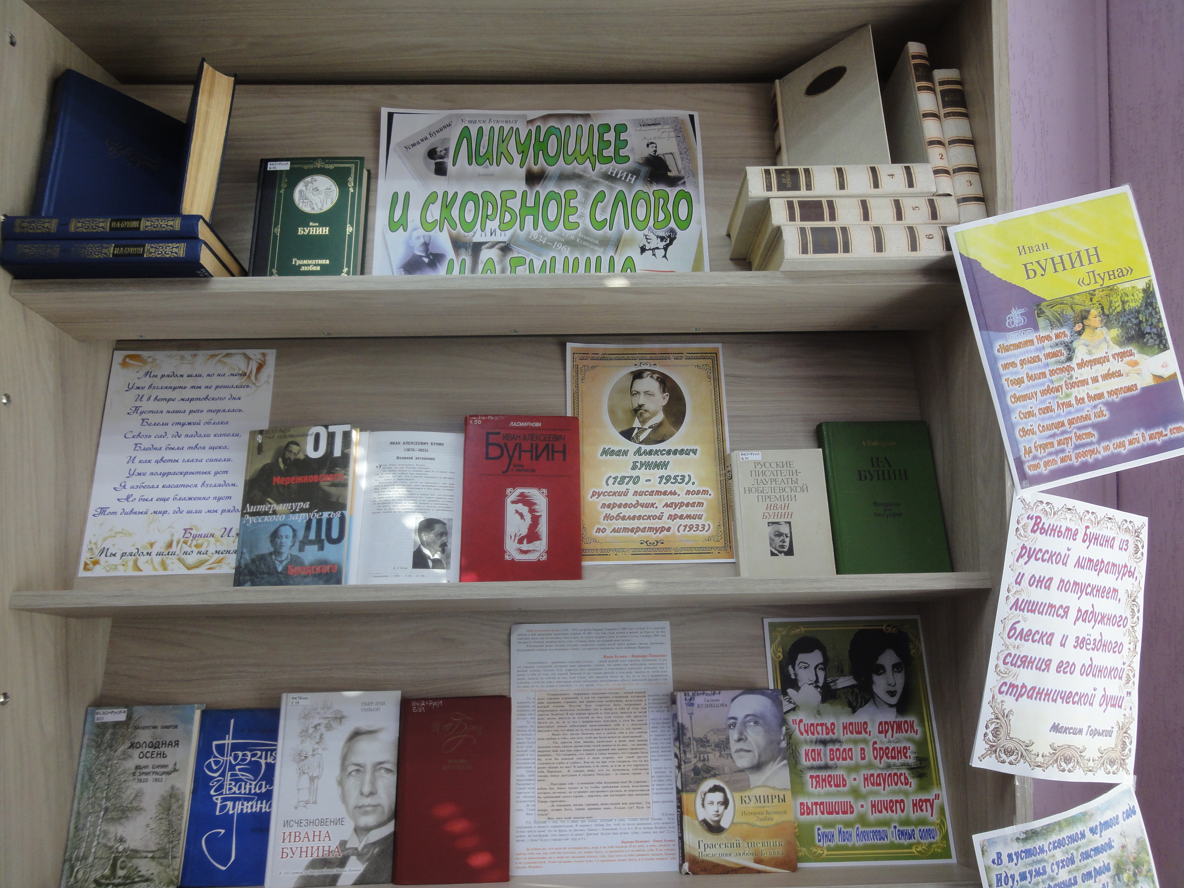 В октябре текущего года исполняется 155 лет со дня рождения замечательного мастера прозы и талантливого лирика, первого русского лауреата Нобелевской премии И.А. Бунина. К этой юбилейной дате в отделе абонемента оформлена книжно-иллюстрированная выставка “Ликующее и скорбное слово И.А. Бунина”.