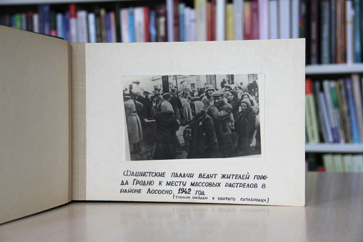 Оформляя раздел о войне, библиотекари нашли в «закромах» старенький альбом «Великая Отечественная война на Гродненщине». Пролистывая его страницы, нельзя остаться равнодушным. Альбом уникален тем, что в нем есть документальные фото того страшного периода нашей истории.