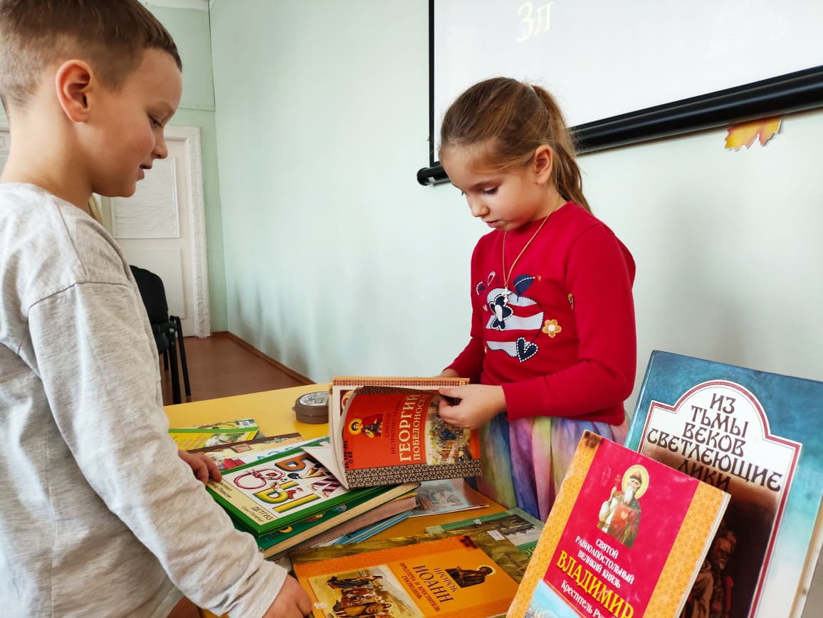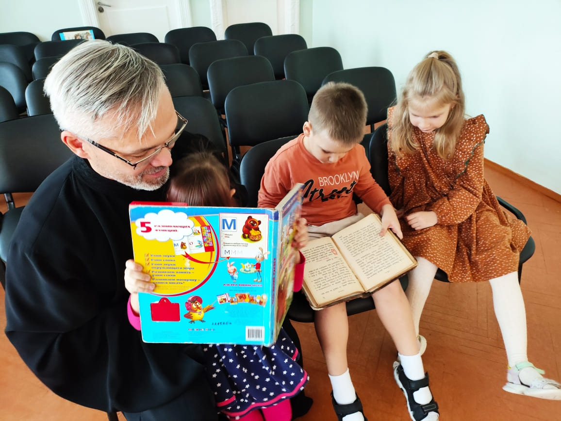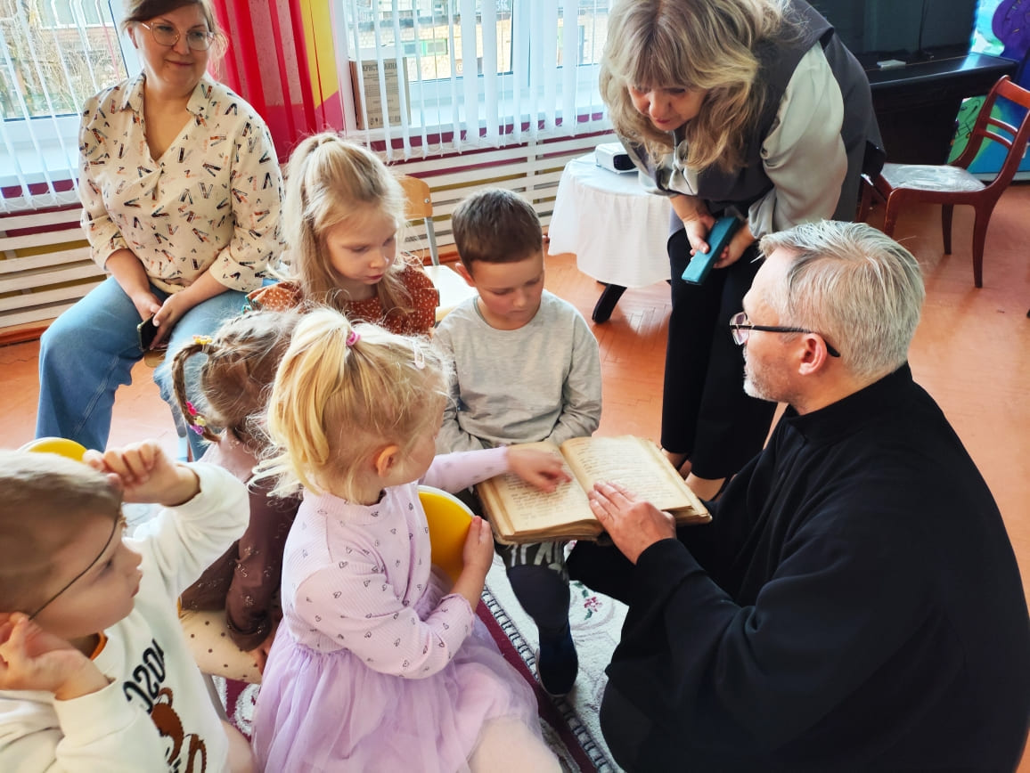 У сустрэчы прымаў актыўны ўдзел Ігумнаў Мікалай ̶ протадыякан храма Святога роўнаапостальнага князя Уладзіміра: малыя мелі магчымасць дакрануцца да сапраўднай старажытнай кнігі.
