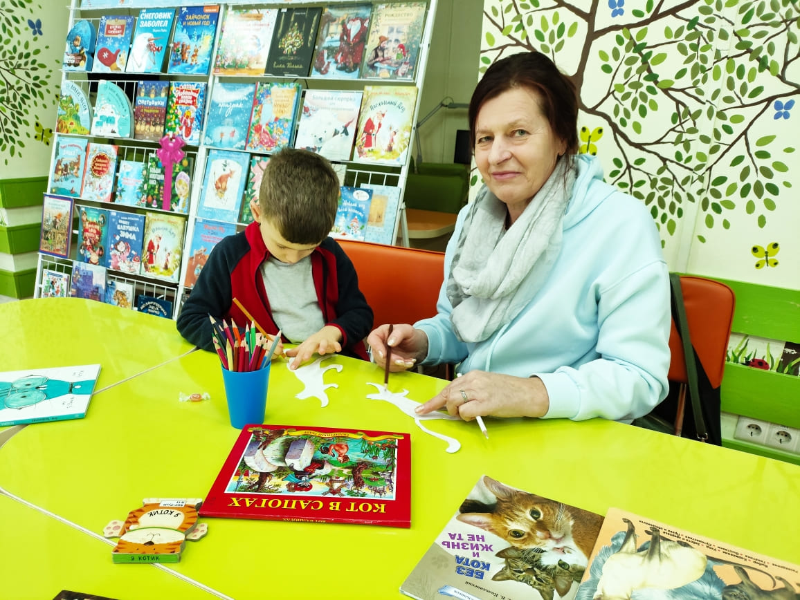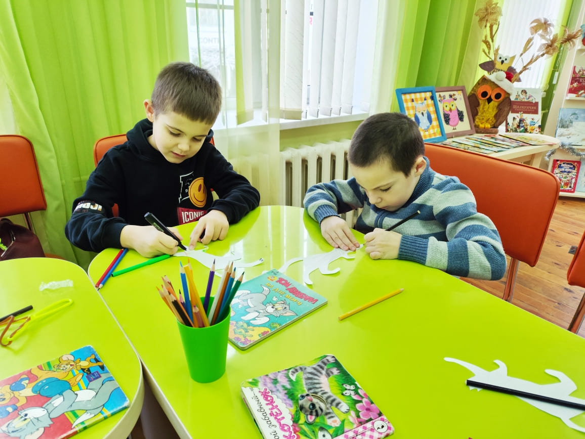 Участники встречи вспомнили героев-котов литературных произведений ̶ кота Леопольда, кота Матроскина, котёнка Гав, котёнка Шмяка, Кота в сапогах, Кота-плутишку, Кота Базилио, Моню и Веню и др., а также нарисовали свою «версию» кота.