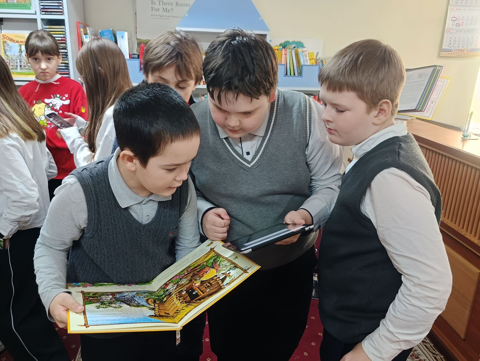 Ребята разделились на команды и получили задания. Лабиринт книжных стеллажей превратился в игровое поле, где каждый уголок мог таить новую подсказку. С помощью планшетов участники шаг за шагом разгадывали головоломки: от логических задач до разгадывания ребусов, спрятанных на страницах книг. Этот интерактивный формат позволил школьникам полностью погрузиться в атмосферу поиска и открытий. Особенно ценным стало то, что вместо традиционной экскурсии ребят ждало динамичное приключение. Они самостоятельно искали информацию, активно советовались и обменивались идеями в командах. Это помогло им не только применить свои знания, но и развить логическое мышление и внимательность.