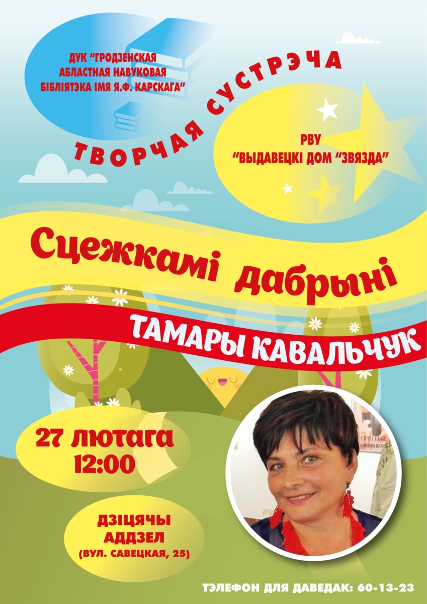 27 лютага а 12 гадзіне запрашаем усіх аматараў літаратуры ў дзіцячы аддзел Гродзенскай абласной навуковай бібліятэкі на творчую сустрэчу з сучаснай беларускай пісьменніцай Тамарай Кавальчук “Сцежкамі дабрыні” пры ўдзеле Выдавецкага дома “Звязда”.