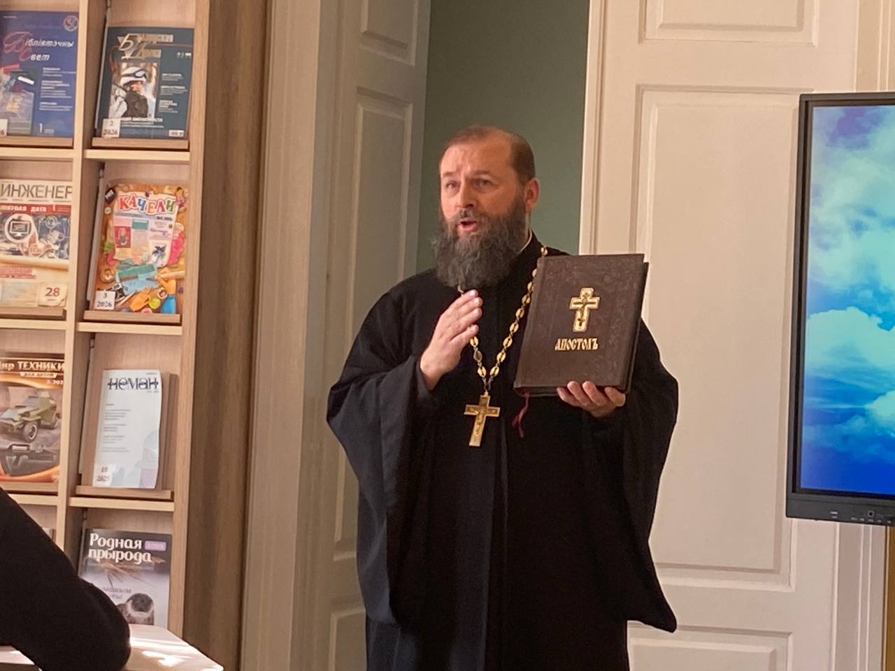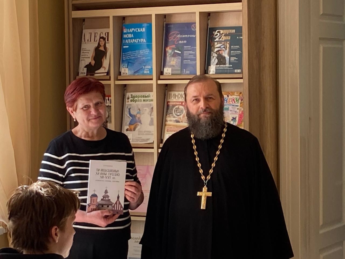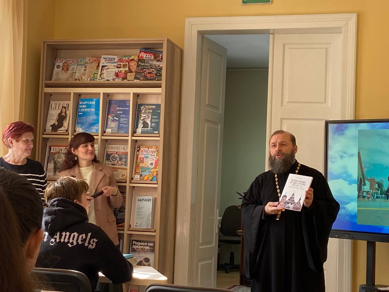 Важным гостем на мероприятии стал протоиерей Владимир Борисевич – настоятель прихода храма святителя Николая Чудотворца вместе с матушкой. Он рассказал ребятам о книгах, которые учат милосердию и состраданию. Благодаря художественному слову духовные вещи нередко открываются яснее и убедительнее, особое внимание отец Владимир уделил главной книге – Библии, познакомил ребят с книгой «Апостол». Настоятель подарил библиотеке книгу Е. Н. Рудаковской «Православные храмы Гродно XII-XVI вв.», а всем участникам мероприятия – иконки Коложской Богоматери.