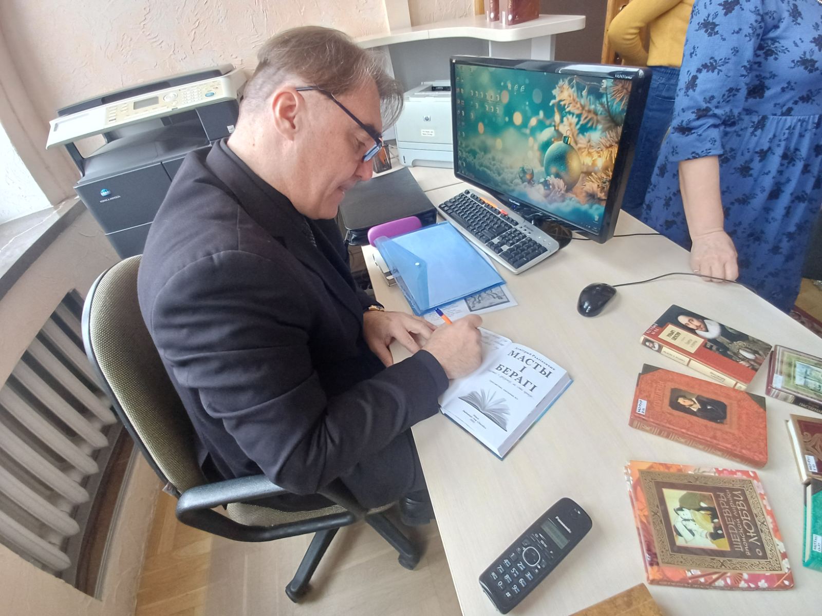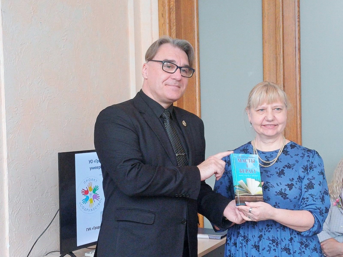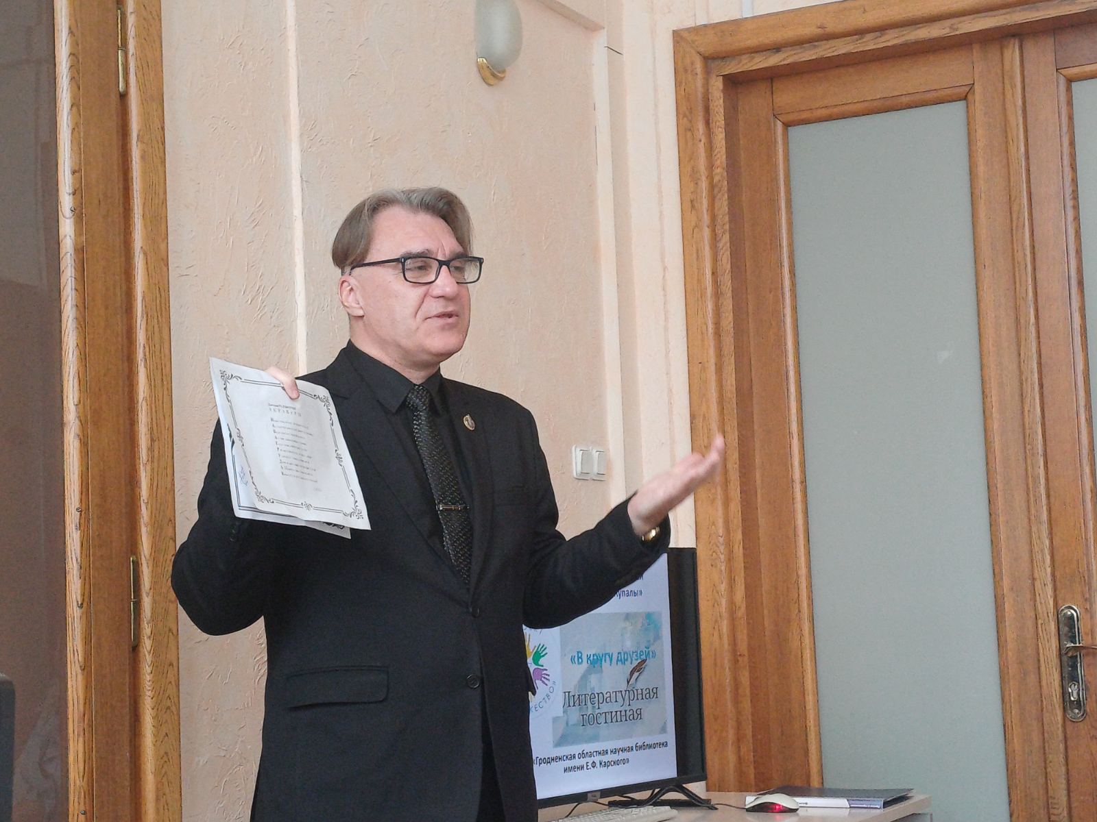 Почетным гостем мероприятия стал Дмитрий Радиончик – заместитель председателя Гродненского отделения Союза писателей Беларуси, поэт, эссеист, литературовед, публицист. Он познакомил присутствующих с интересными формами стихосложения и продемонстрировал их на своих произведениях. На память об этой встрече поэт подарил свою новую книгу «Масты і берагі» старшему преподавателю кафедры русского языка как иностранного ГрГУ им. Я. Купалы – Мазько Г.Ч., с которой смогут ознакомиться все студенты.