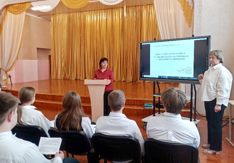 Так заведующий отделом обслуживания и информации Ивьевской районной библиотеки Таиса Ивановна Грикень выступила в качестве почетного гостя проекта «ШАГ» в Ивьевской средней школе. Центральной темой диалоговой площадки, объединившей старшеклассников и их классных руководителей, стало глубокое осмысление понятия «Быть достойным гражданином Республики Беларусь – значит разделять и поддерживать духовные ценности белорусского общества».