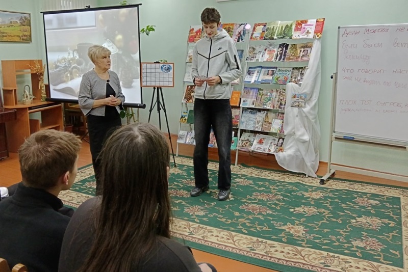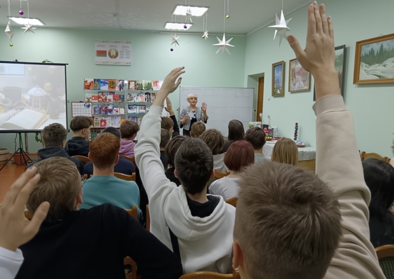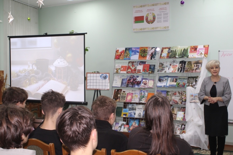 Новогрудская районная библиотека пригласила учащихся Новогрудского колледжа технологий и безопасности на литературно-развлекательную программу «Рождество и Новый год ждут народ у ворот». Многочисленные творческие задания и конкурсы не дали ребятам заскучать. Присутствующие не только повеселились, но и показали свои знания, отвечая на вопросы викторины, отгадывая загадки и разгадывая поэтический кроссворд о сказочной поре года – зиме. С удовольствием участвовали ребята в интеллектуальном конкурсе – с помощью подсказок-книг нужно было догадаться, кому принадлежат цитаты о лошадях. Много улыбок и эмоций вызвало задание с дополнением незаконченных фраз, написанных на доске. На книжной экспозиции были представлены зимние новогодние книги, сказки известных писателей об этом удивительно-волшебном времени года.